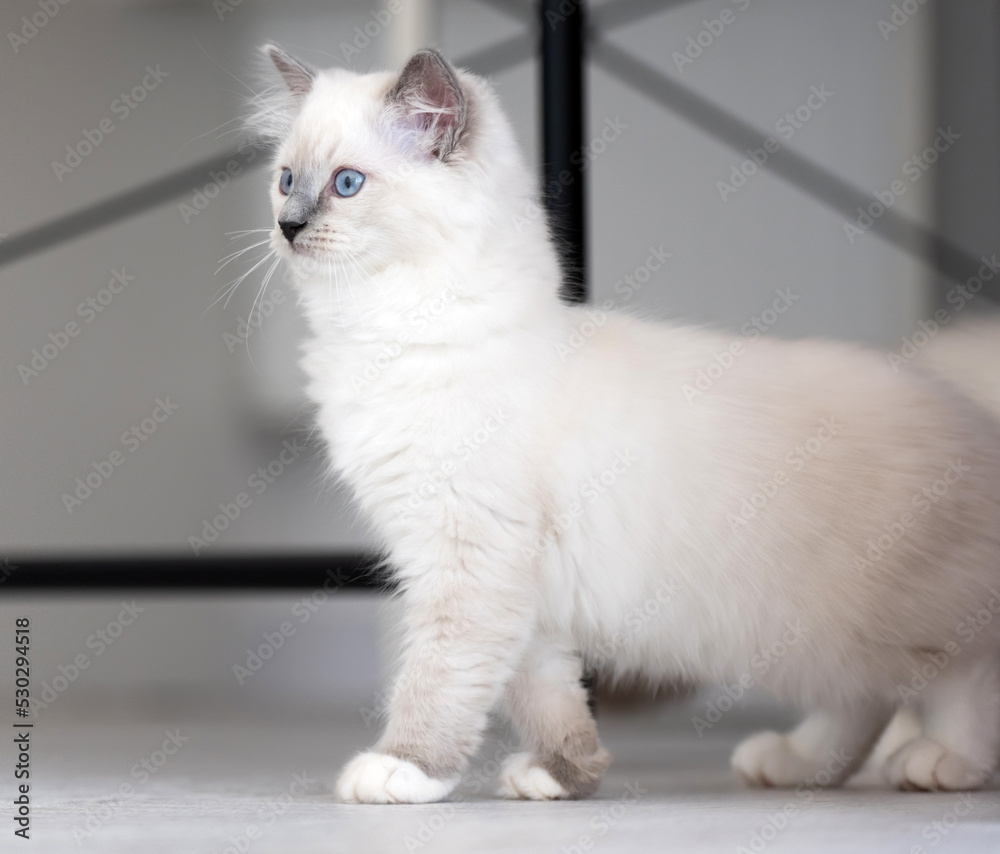 Adorable white fluffy ragdoll cat with beautiful blue eyes and grey ears standing on the floor and looking back. Domestic purebred feline pet at home