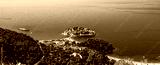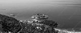 Sveti Stefan island in Montenegro from above. Scenic view on adriatic sea from mountains close to Budva