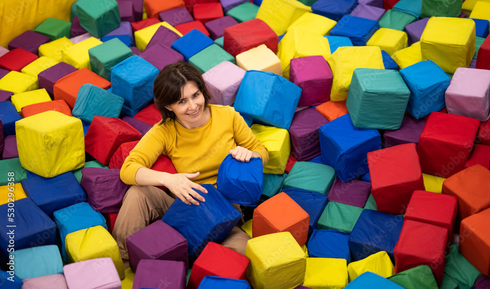 Pretty girl lying in trampoline colorful cubes and smiling. Young woman enjoying entertaiments at playground park