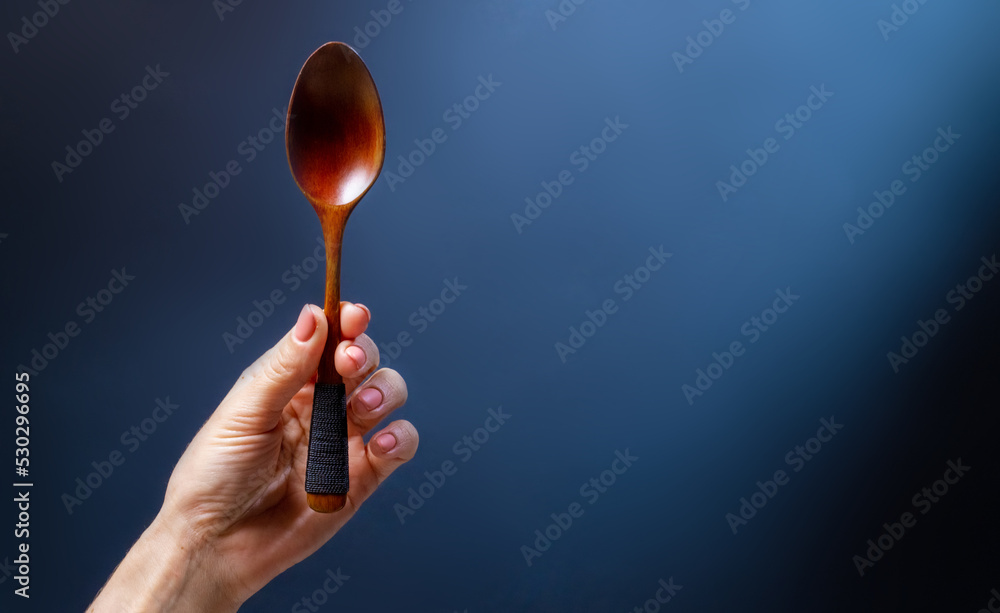 Hand holding wooden spoon for soup. Craft handmade kitchen flatware on blue background