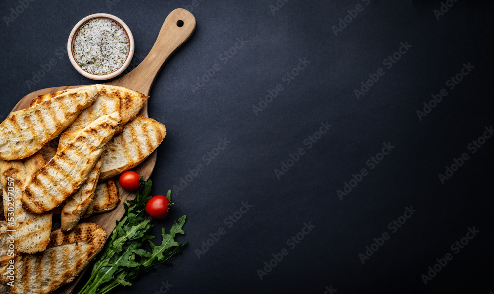 Toasts with cherry tomatoes, arugula and salt on wooden board on background with copyspace. Sliced toasted bread with vegetables and herbs