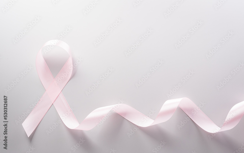 Pink ribbon on pastel paper background for supporting breast cancer awareness month campaign.