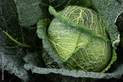 Background and texture of savoy cabbage growing in the field. The green leaves are covered with water droplets.