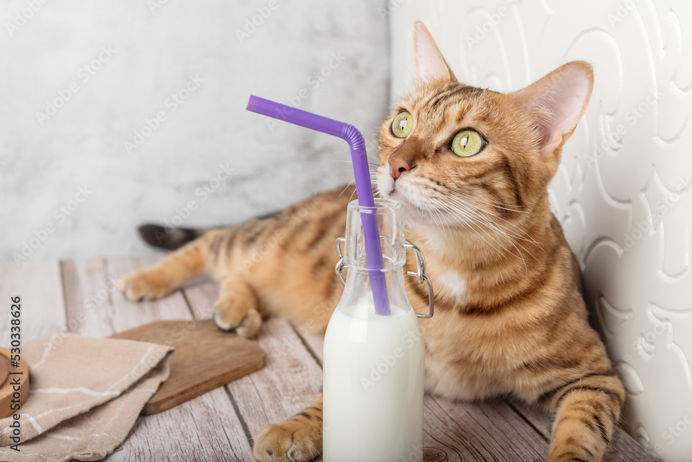 Domestic cat drinks milk from a bottle through a straw.