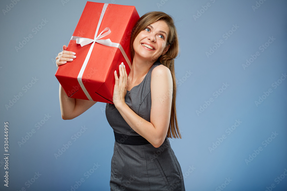 Happy woman holding red gift box on shoulder, looking up, isolated portrait.