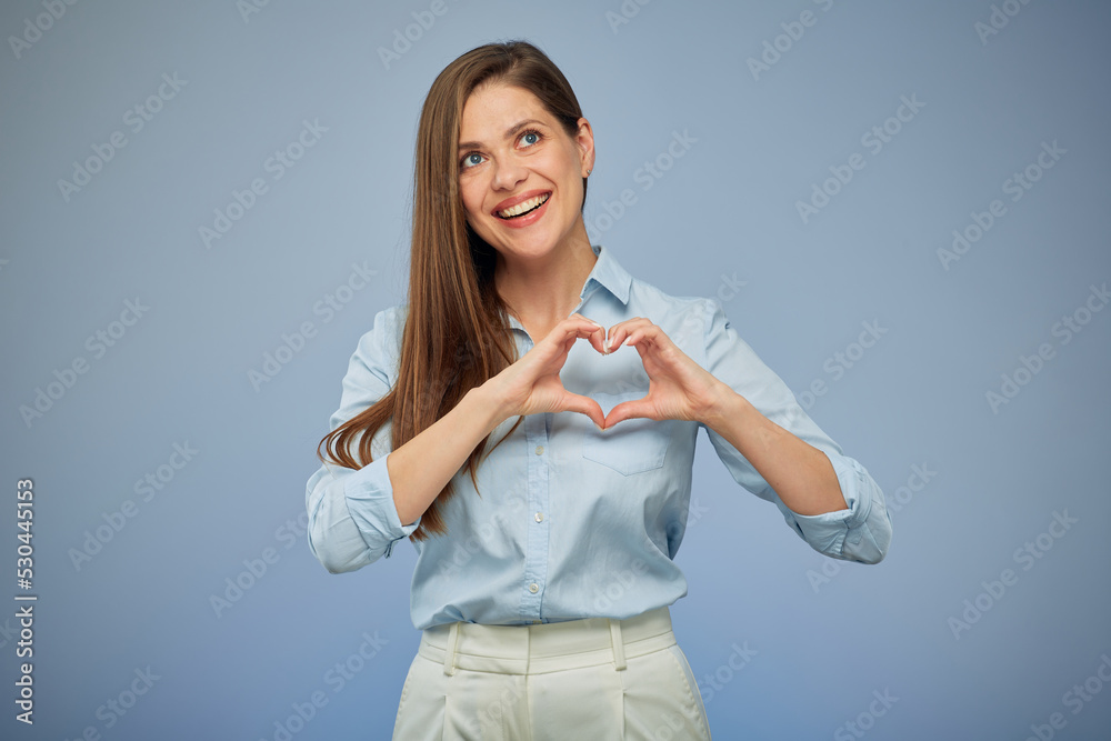 Smiling woman making heart shape with hands. Isolated portrait female portrait on blue.