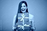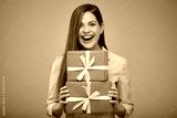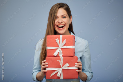 Young happy woman holding stack of gift boxes. Isolated female portrait.