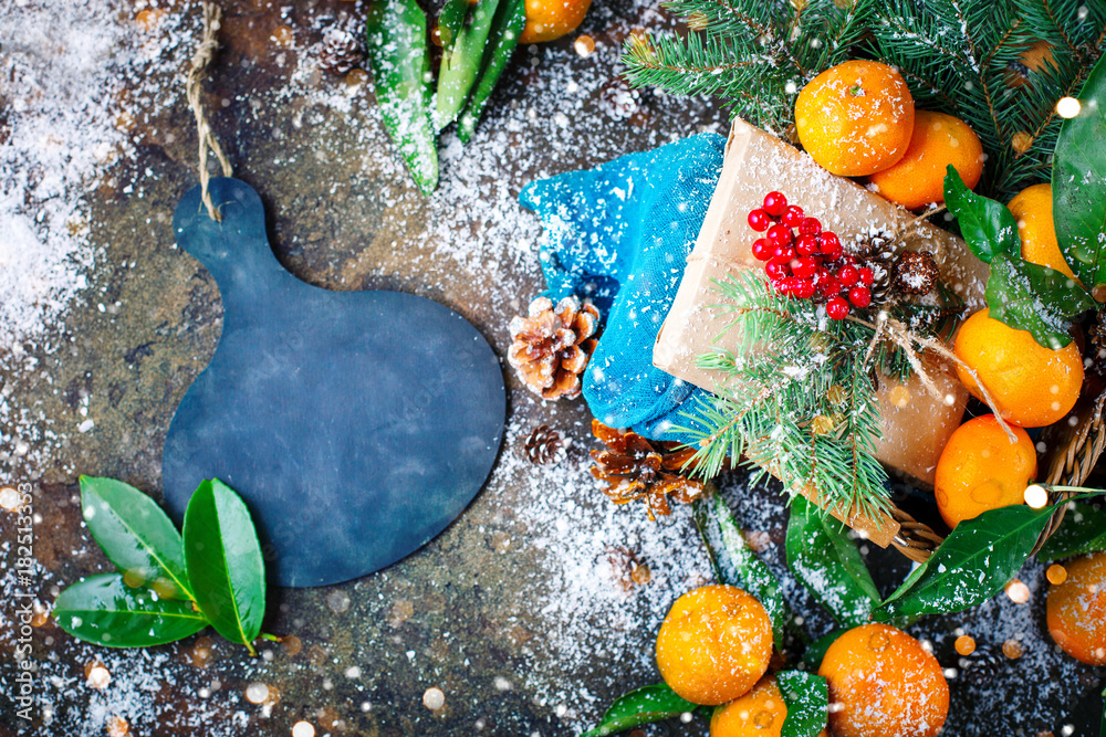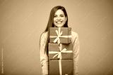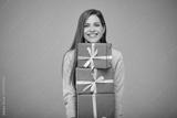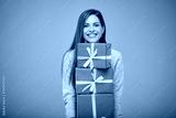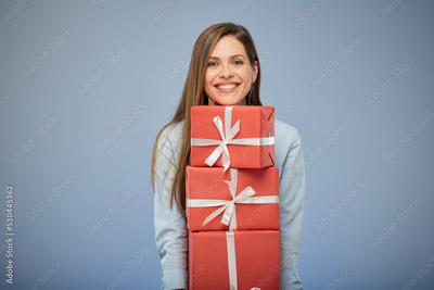 Happy woman holding stack of red gift boxes. Isolated female portrait on blue background.