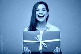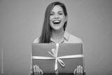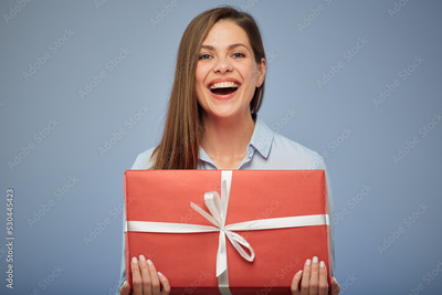 Happy woman holding big red gift box. Isolated female portrait on blue.