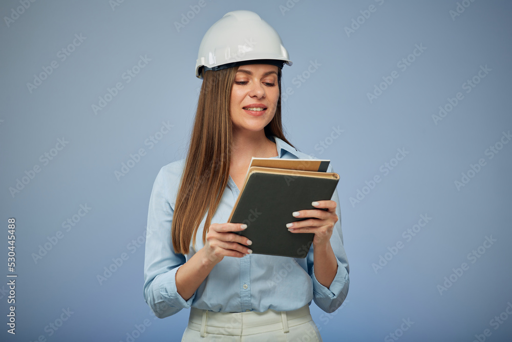 Woman engineer in protective helmet looking on book. Isolated female portrait.