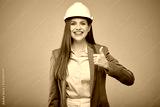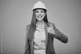 Smiling woman builder in white safety industrial helmet. Isolated female portrait with thumb up.
