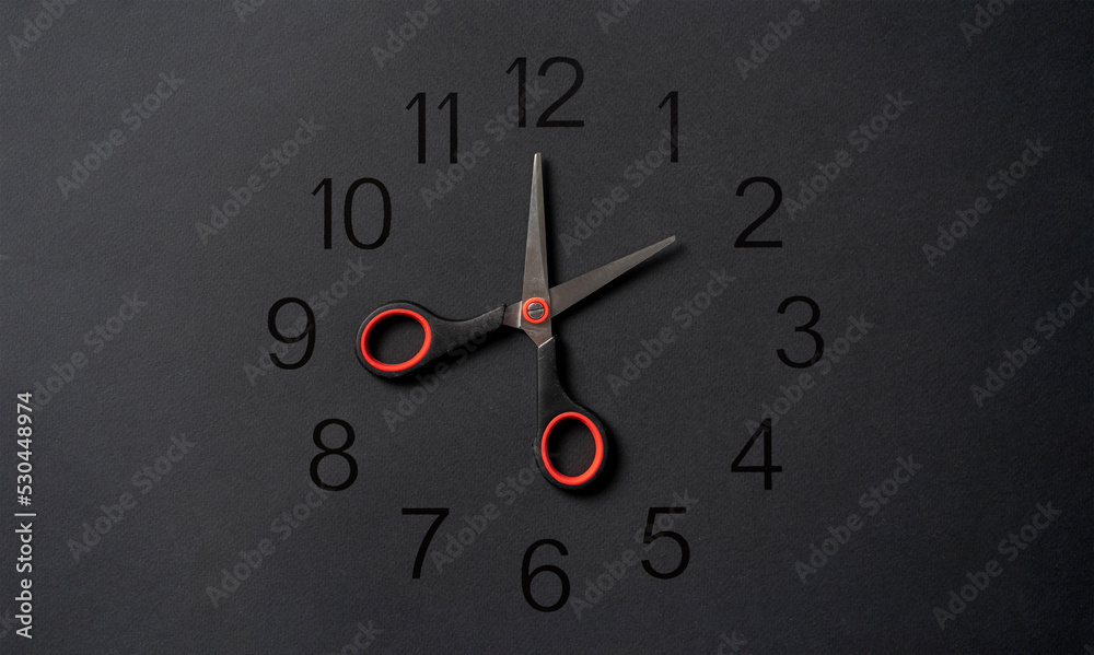 creative layout of hour clock made of scissors on pastel background