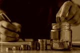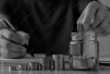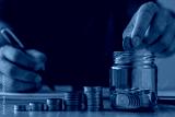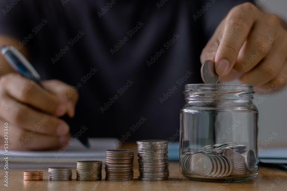 Business finance accounting investment saving money concept. Man hand holding coins putting in jug glass with coins stack step growing for financial planning responsibility expenses and income.