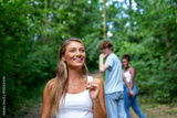 Disloyal man walking with his girlfriend and looking amazed at another seductive girl