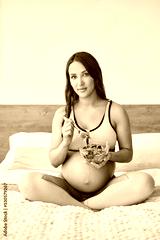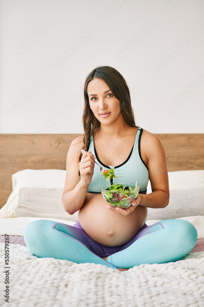 Portrait of young pregnant woman in sportswear eating a fresh salad sitting in bed