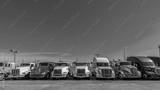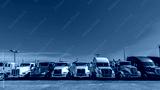Lined up Semi trucks on a parking lot at logistics warehouse