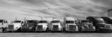 Lined up Semi trucks on a parking lot at logistics warehouse with orange sunset sky