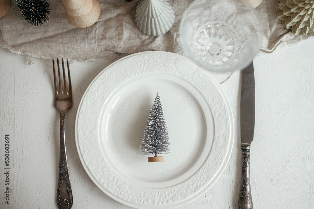 Modern Christmas table setting flat lay. Stylish little christmas tree on plate, vintage cutlery, glasses, festive fir and houses on white rustic table. Holiday arrangement of table
