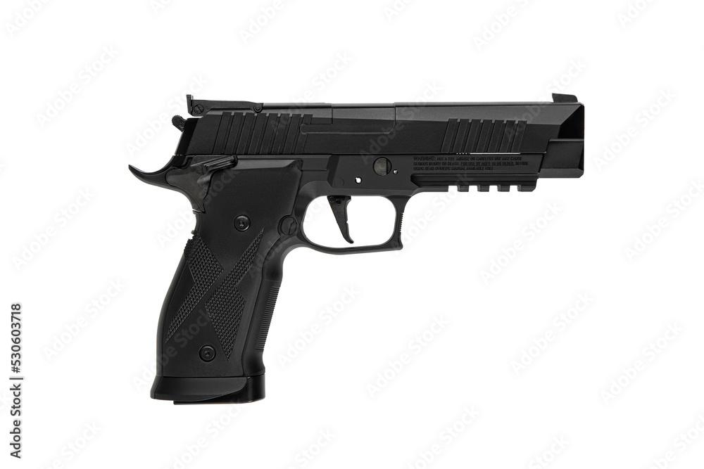 Air gun. Modern pneumatic weapon for air soft, sports and entertainment. A dummy, a copy of a real pistol. Isolate on a white back