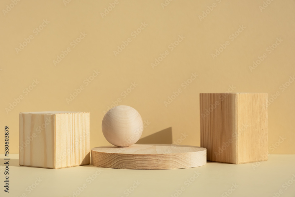 Wooden scenes of different geometric shapes on a beige background. Premium podium for advertising your product. Minimal backdrop for product presentation. Showcase, display case.