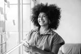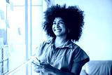 Happy black businesswoman using a smartphone in a creative office