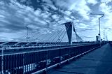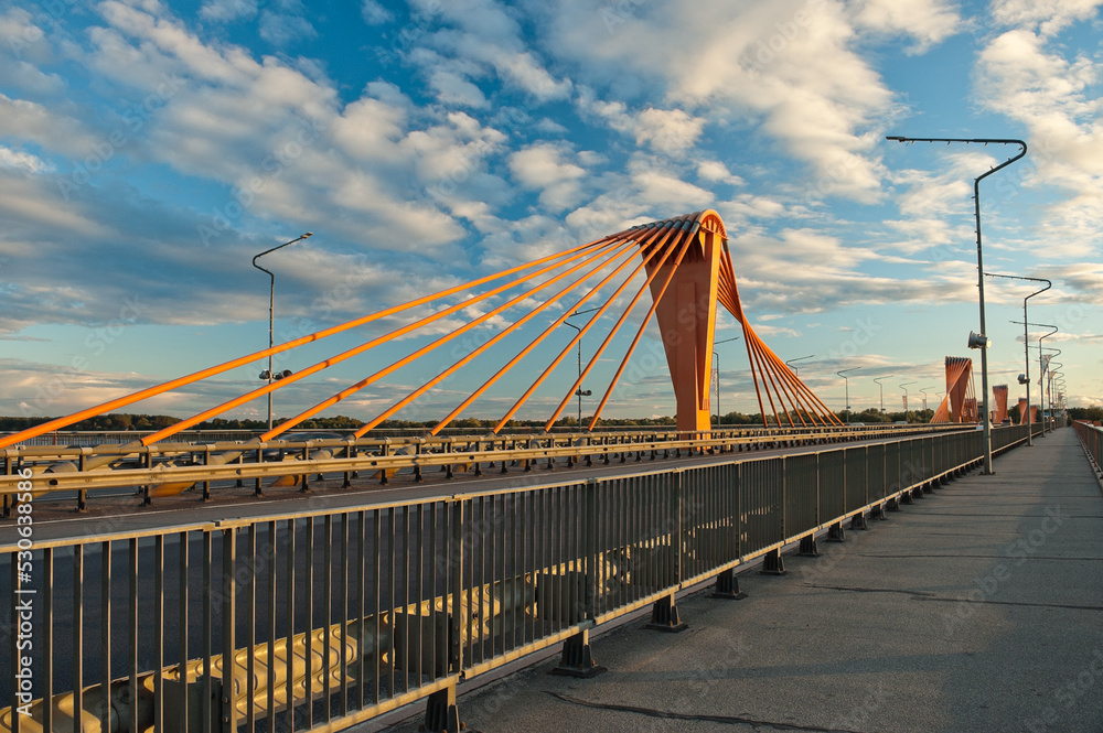 cable-stayed bridge in Riga, in the photo south bridge in the evening against the background of blue sky and clouds