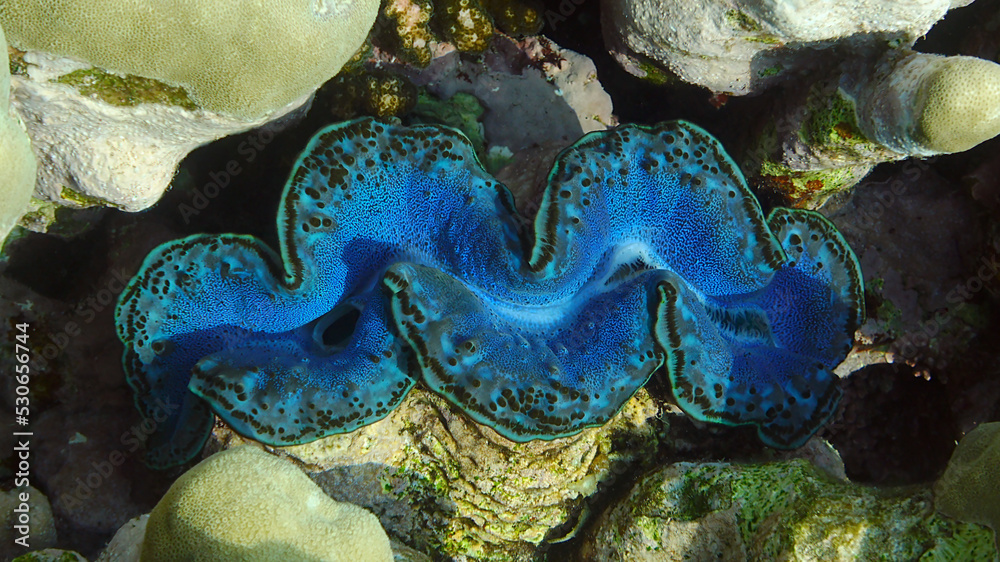 shell on a seabed Blue shell tridacna in the coral reef of the Red sea
