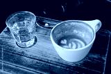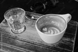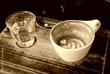 Coffee with latte art is drunk. Ceramic cup and glass of water on brown wooden table in cafe