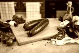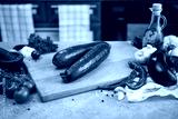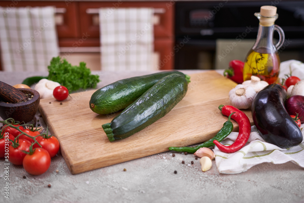 zucchini on wooden cutting board and vegetables at domestic kitchen