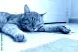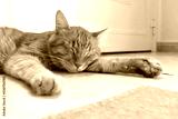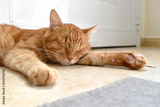 Ginger cat sleeping on the floor at home. Photo can be used for the concept of how to stop cat scratching the rug or carpet and how to remove pets hair on the rug or carpet.
