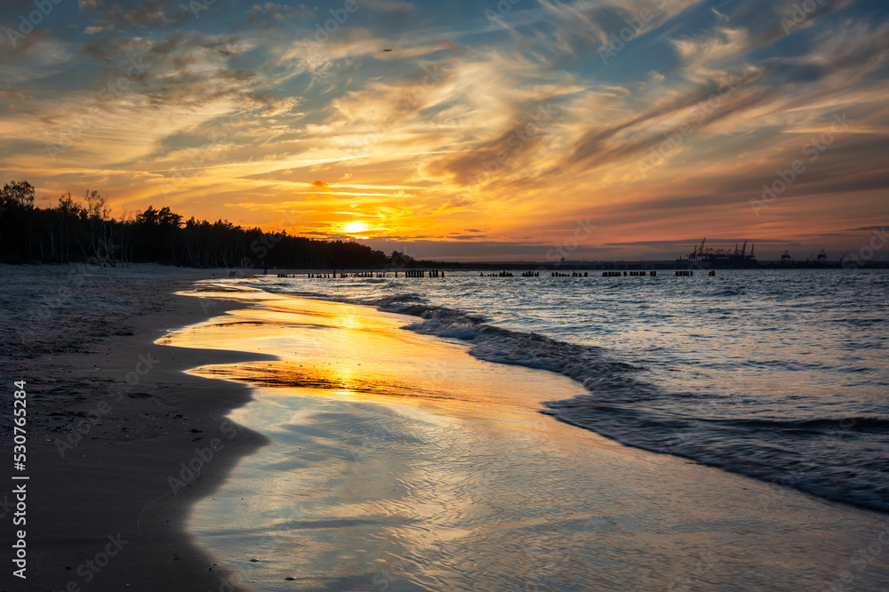 Sunset on the beach of the Baltic Sea in Gdansk, Poland