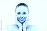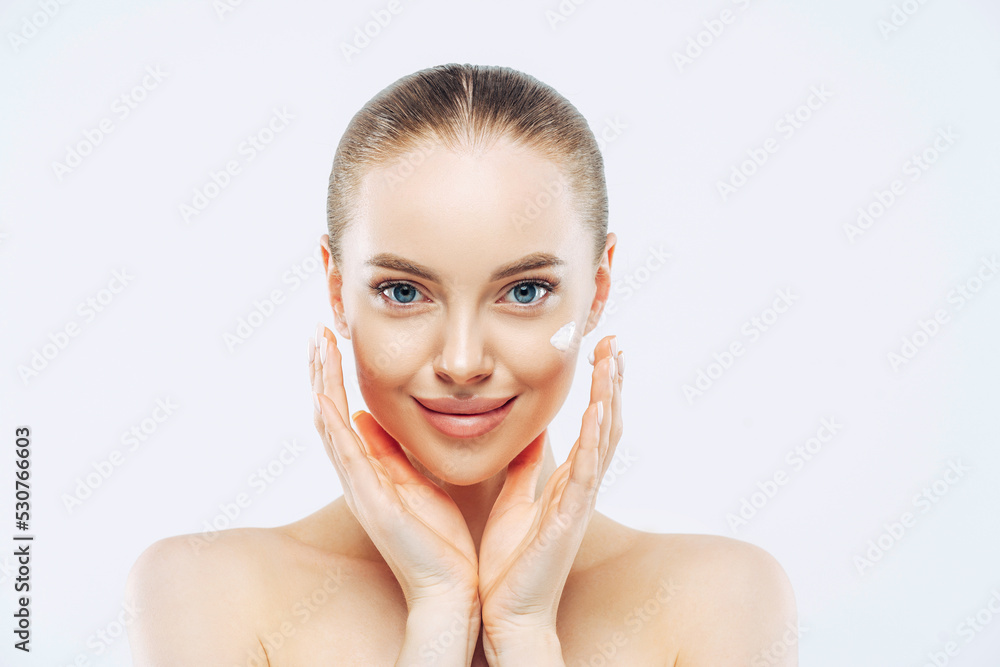 Close up shot of attractive naked young woman with combed hair, applies face cream or lotion, touches face, has natural makeup, poses against white background, looks after skin. High resolution