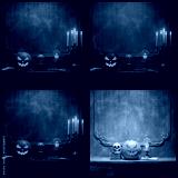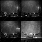 Scary laughing pumpkin and old skull on ancient gothic fireplace. Halloween, witchcraft and magic concept. Set collage.