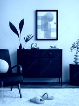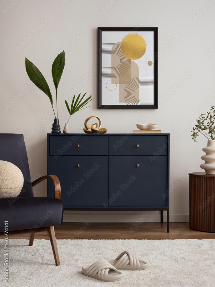 Contemporary design of living room interior with mock up poster frame, blue velvet armchair, commode, beige carpet, leaf in vase and personal accessories. Creative home decor. Template.