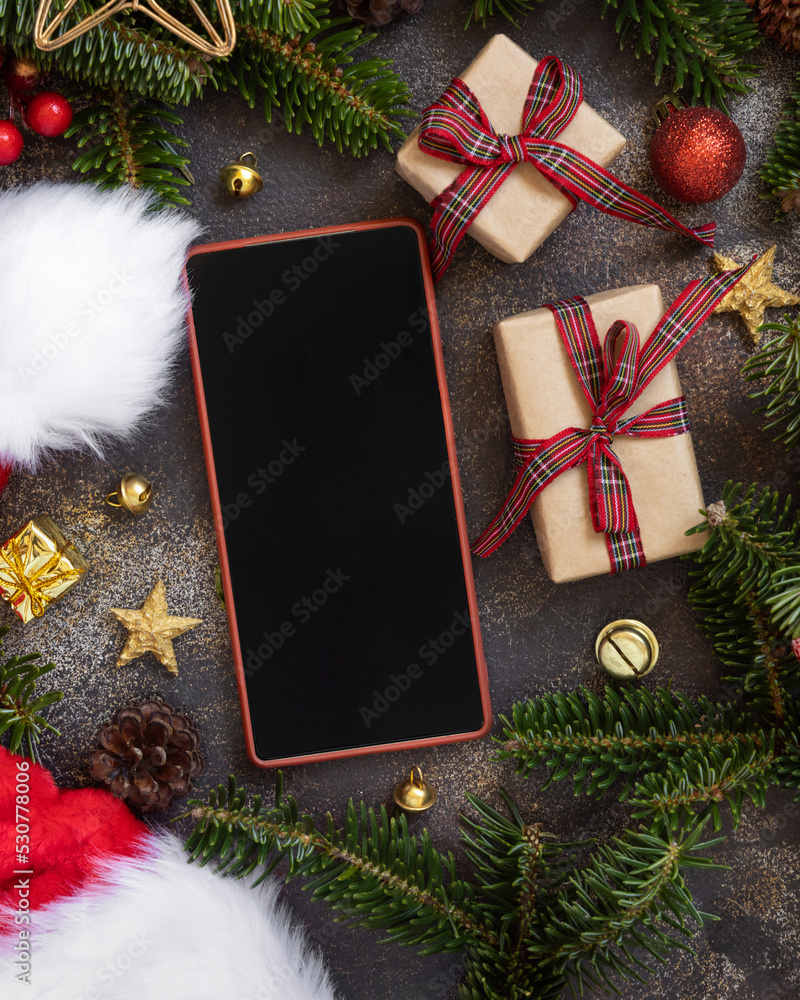 Mobile phone between Christmas decorations, Santa Claus hat, gift boxes and green fir branches