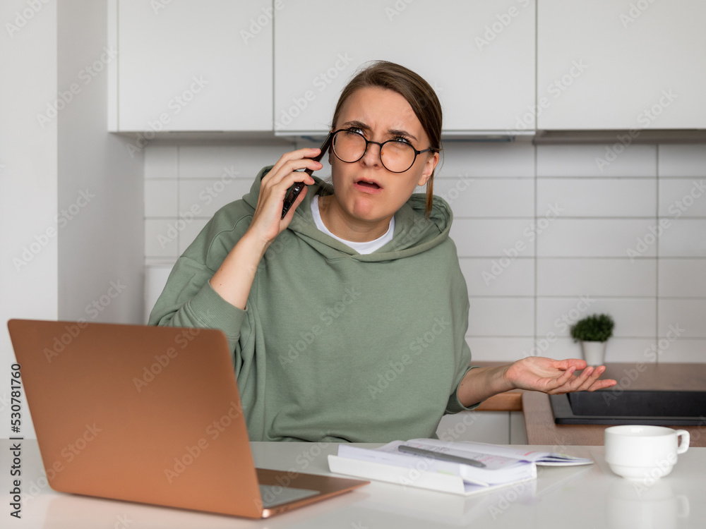 A young woman is sitting in the kitchen in front of a laptop and talking on the phone. On the face of a woman, the emotion of bewilderment of surprise or disappointment
