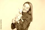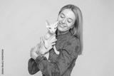Charming Woman petting hairless cat Sphynx breed with pink naked skin in her hands. Sphynx cat in hand of beautiful woman who loves cat friendship on yellow background