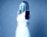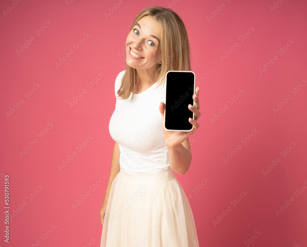 Portrait of a smiling happy blond woman showing blank screen mobile phone while standing isolated over pink background. Woman in white dress holds smartphone with black screen. Focus on woman face