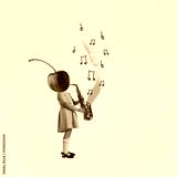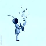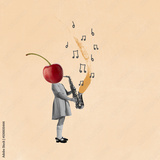 Contemporary art collage. Little girl, child with cherry head playing saxophone. Music lifestyle