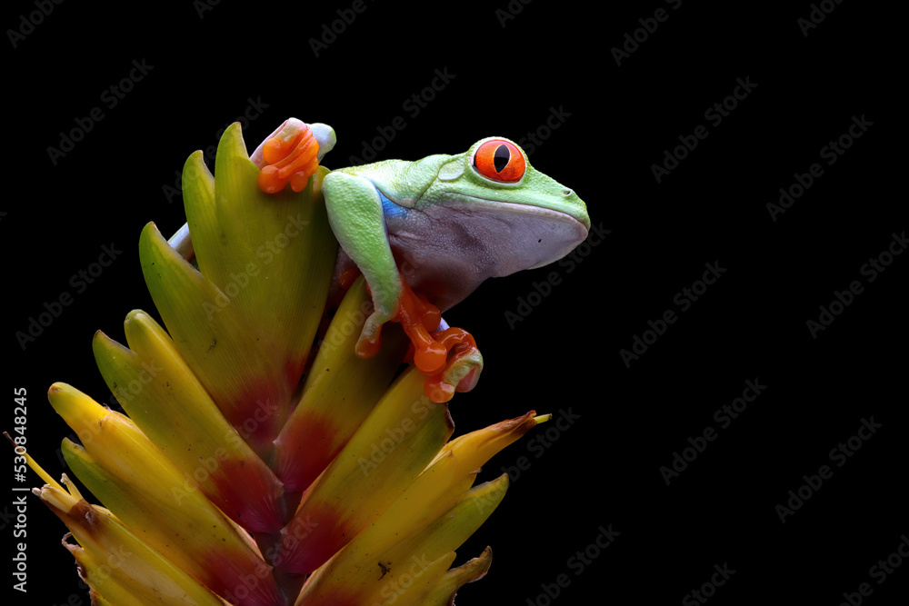 Red-eyed tree frog sitting on flower, red-eyed tree frog (Agalychnis callidryas) closeup