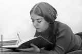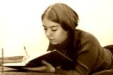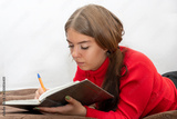 A young girl takes notes in an old notebook lying on the couch. Concept: the beginning of the academic year, remote training of students.