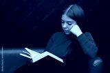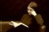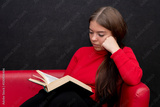 A young girl is reading a thick book sitting on a red sofa on a black background. Concept: the beginning of the academic year, remote training of students.