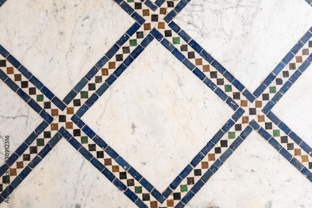 Roof tiles pattern on squared white marble wall Arabian style abstract texture background in Marrakesh, Morocco