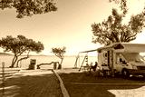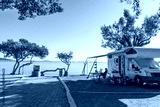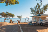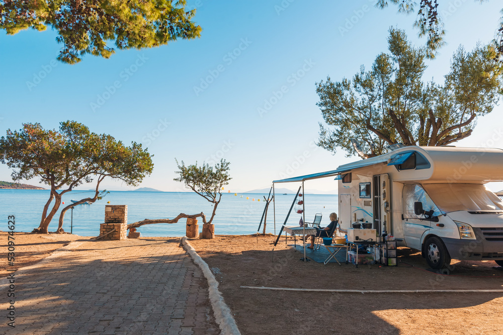 Family traveling with motorhome are eating breakfast on a beach. Travelers on an active family vacation with motorhome RV parked on the beach under a tree facing the sea, Crete, Greece.