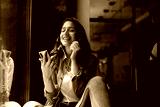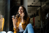 Young woman sitting and listening the music. Portrait of happy woman listening music with earphones while singing song.