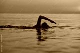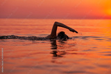 Young woman swimming in the sea on sunrise