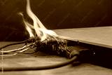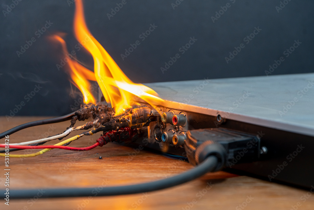 A DVD player is burning on the table, network cables are burning and sparking, flames are rising up, a fire has started in the apartment.