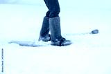 A man in felt boots on homemade skis walks through the snow into the forest. Hiking, traveling, hunting, fishing.