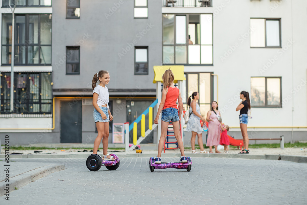 Happy children riding on hoverboards or gyro scooters outdoors in summer. Active life concept.