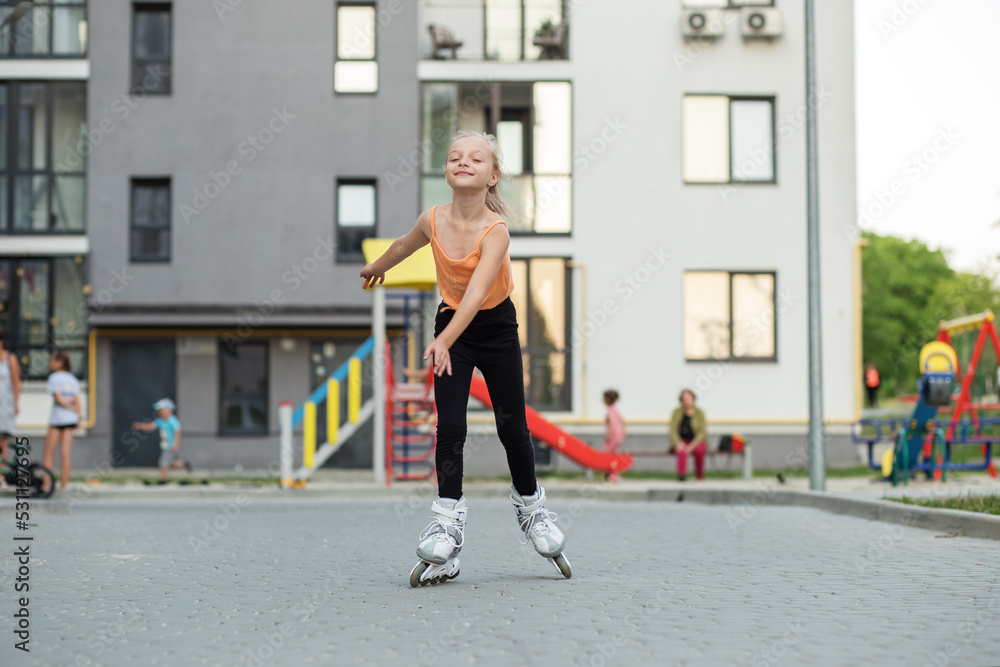 Pretty child on roller skates riding. Little girl learning to roller skate outdoors in playground.
